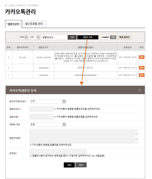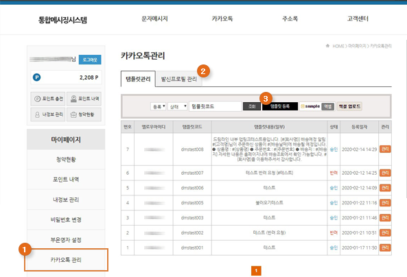마이페이지 - 카카오톡 관리를 클릭하시면 카카오톡의 템플릿을 등록/ 삭제 , 발신프로필을 관리하실 수 있습니다.