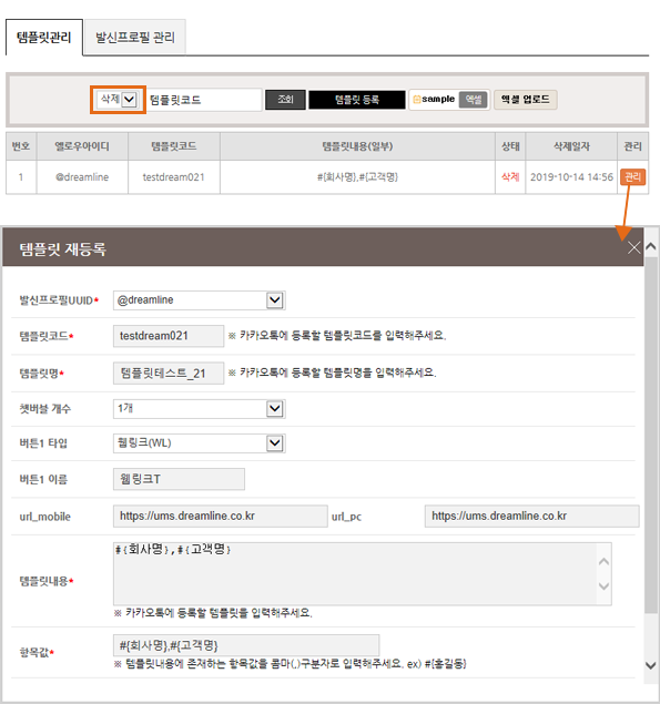 ③ 템플릿 관리 상태가 삭제일때 관리 버튼을 누르면 템플릿 재등록이 나타납니다.