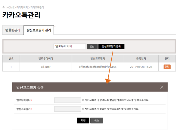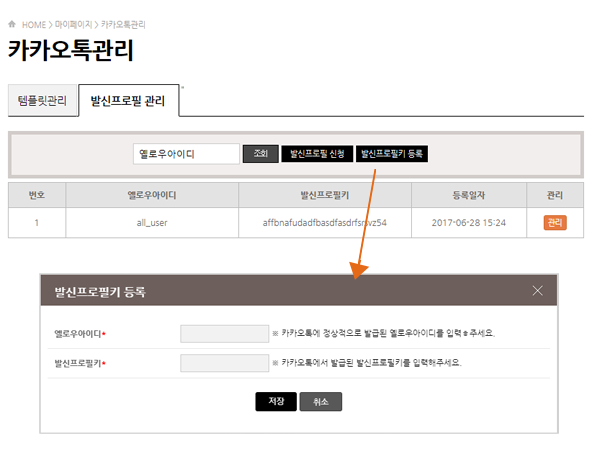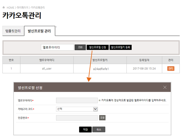 ② 발신 프로필키를 등록하시면 발신프로필키 등록페이지가 나타납니다.