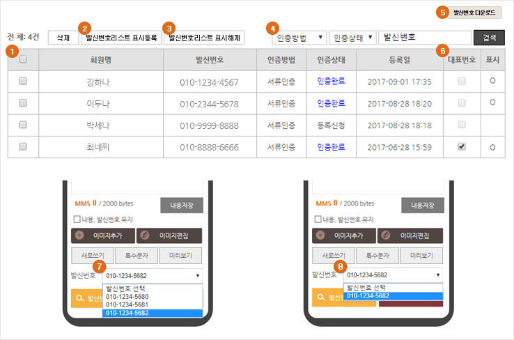 : 체크박스 선택 후 발신번호 리스트 표시 등록 버튼을 클릭하시면 표시에 O가 나타나고 ⑦과 같이 발신번호 선택창에 모든 선택된 번호가 보여집니다.